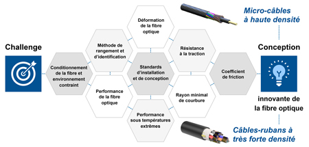 Chaque point d’accès nécessite une fibre optique ce qui conduit à un accroissement des faisceaux de fibres alors que les voies d’accès acheminant ces fibres demeurent fixes et saturées. Par conséquent, il est essentiel d’installer autant de fibres optiques que nécessaire au sein d’un câble, aussi petit soit-il. Toutefois, cette activité exige une ingénierie complexe.