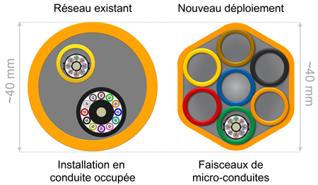Lorsqu’une nouvelle infrastructure de conduits est nécessaire, les micro-conduits à voies multiples offrent une plus grande capacité que les conduits traditionnels. Un conduit de 40/33 mm a approximativement la même taille qu’un faisceau de micro-conduits à trajets multiples de 7 x 10/8 mm (40 mm) et bien que tous deux coûtent initialement le même prix, le faisceau de micro-conduits offre six voies supplémentaires par rapport au conduit traditionnel, permettant des améliorations rapides et peu coûteuses pour des futures capacités, avec une capacité totale de 2 016 fibres (7 x 288 micro-câbles haute densité de fibres).