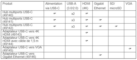 Les hubs USB-C™ multiports offrent de nombreuses options de connectivité. Par exemple, le modèle le plus complet de Verbatim (photo ci-contre) propose trois ports USB-A 3.0, un port d’alimentation USB-C™, un port HDMI afin de connecter des dispositifs d’affichage en 4K, un port Ethernet pour se connecter à des réseaux filaires, ainsi que des lecteurs de cartes SD et microSD pour lire et transférer des fichiers vers ou depuis des cartes SD ou microSD. Verbatim possède des hubs avec différentes configurations selon les préférences des utilisateurs (voir le tableau ci-dessous).