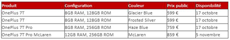 Le OnePlus 7T sera disponible en deux couleurs : Glacier Blue et Frosted Silver. Le OnePlus 7T Pro, quant à lui, sera disponible en Haze Blue, et en édition limitée McLaren le mois prochain.