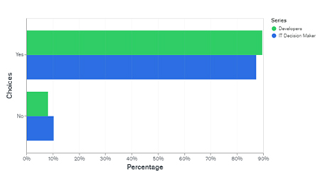 Les développeurs sont conscients des exigences commerciales de leurs employeurs. Près de 94 % des développeurs affirment comprendre les priorités commerciales de l’entreprise dans laquelle ils travaillent. Mieux encore, plus de 88 % des décideurs IT sont d’accord. C’est une évolution.