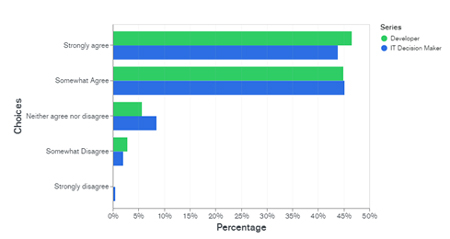 Et cet alignement sur les priorités commerciales se retrouve jusqu’à la prise de décision proprement dite. Plus de 90 % des développeurs interrogés pensent que les décideurs IT prennent la bonne décision lors de l’achat d’un nouveau logiciel et - le croiriez-vous ? - ce chiffre est supérieur que celui exprimé par les décideurs IT eux-mêmes sur leurs propres décisions.