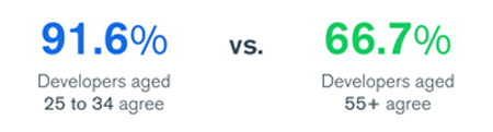 Penchons-nous sur cette tendance : 93 % des développeurs de 25 à 44 ans pensent que les décideurs informatiques et les développeurs sont d’avis convergents sur les décisions stratégiques. Ce pourcentage chute à 62 % pour les 55 ans et plus.