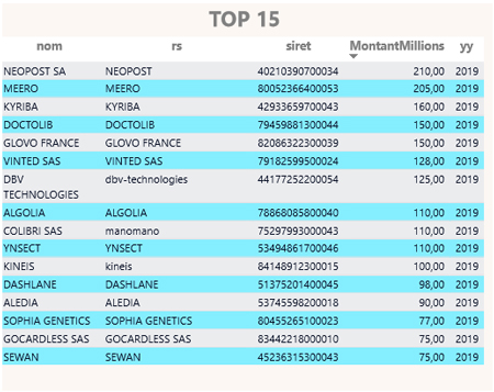 Dans le palmarès des entreprises qui ont perçu du financement externe, on retrouve notamment Meero, Doctolib, Vinted SAS, Kyriba ou encore Glovo France. De manière générale, et sur la période de janvier à novembre 2019, le Groupe IDAIA, via son BIG DATA LAB, a identifié 858 levées de fonds réalisées auprès d’entreprises françaises, représentant un montant total de 7,79 milliards d’euros. Parmi ces levées de fonds allant de moins d’1 à plus de 50 millions d’euros, le Groupe IDAIA montre que près de 98% de ces dernières avaient un montant inférieur ou égal à 50 millions d’euros, dont plus de 40% sur une tranche entre 1 et 5 millions d’euros.