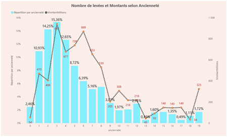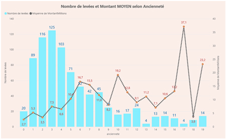 Un engouement particulier pour les entreprises de 3 ans a été relevé, puisqu’elles ont levé en 2019 à elles seules, 941 millions d’euros, soit 15,36% de l’ensemble des levées de fonds sur cette période de l’année. Dans le détail, ce sont 125 levées réalisées sur cette typologie d’organisation dont le montant moyen était de 7,5 millions d’euros. C’est donc la tranche d’entreprises qui a levé le plus de fonds en 2019.