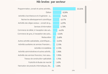 Les analyses poussées du BIG DATA LAB ont également permis de déterminer les secteurs d’activités les plus prisés par les investisseurs. Comme l’illustre le top 10 des entreprises ayant levé les montants les plus importants sur ces dix derniers mois, ce sont les structures œuvrant dans la programmation, le conseil et autres activités liées au numérique qui prennent la première marche du podium avec 22,26% des levées de fonds réalisées. S’en suivent les organisations dans l’édition qui ont été 8,28% à recevoir du financement sur cette période.