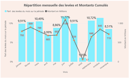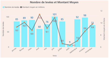 Rétrospectivement, si l’on s’intéresse aux périodes les plus propices aux levées de fonds, les interprétations du Groupe IDAIA montrent que mars, juin, septembre et octobre furent fastes en termes d’investissement. En effet, ces 4 mois représentent à eux seuls près de 45% des levées de fonds réalisées sur les 11 mois de l’année. Cependant, le mois d’avril, qui n’a représenté que 6,99% des levées de fonds sur cette période fut favorable à des montants plus conséquents avec en moyenne des levées avoisinant les 11,4 millions d’euros.