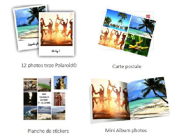 L’application mobile permet d’imprimer des photos sur différents supports et produits personnalisables : photos de type Polaroid, cartes postales, planches de stickers, magnets, mini album photos, etc.